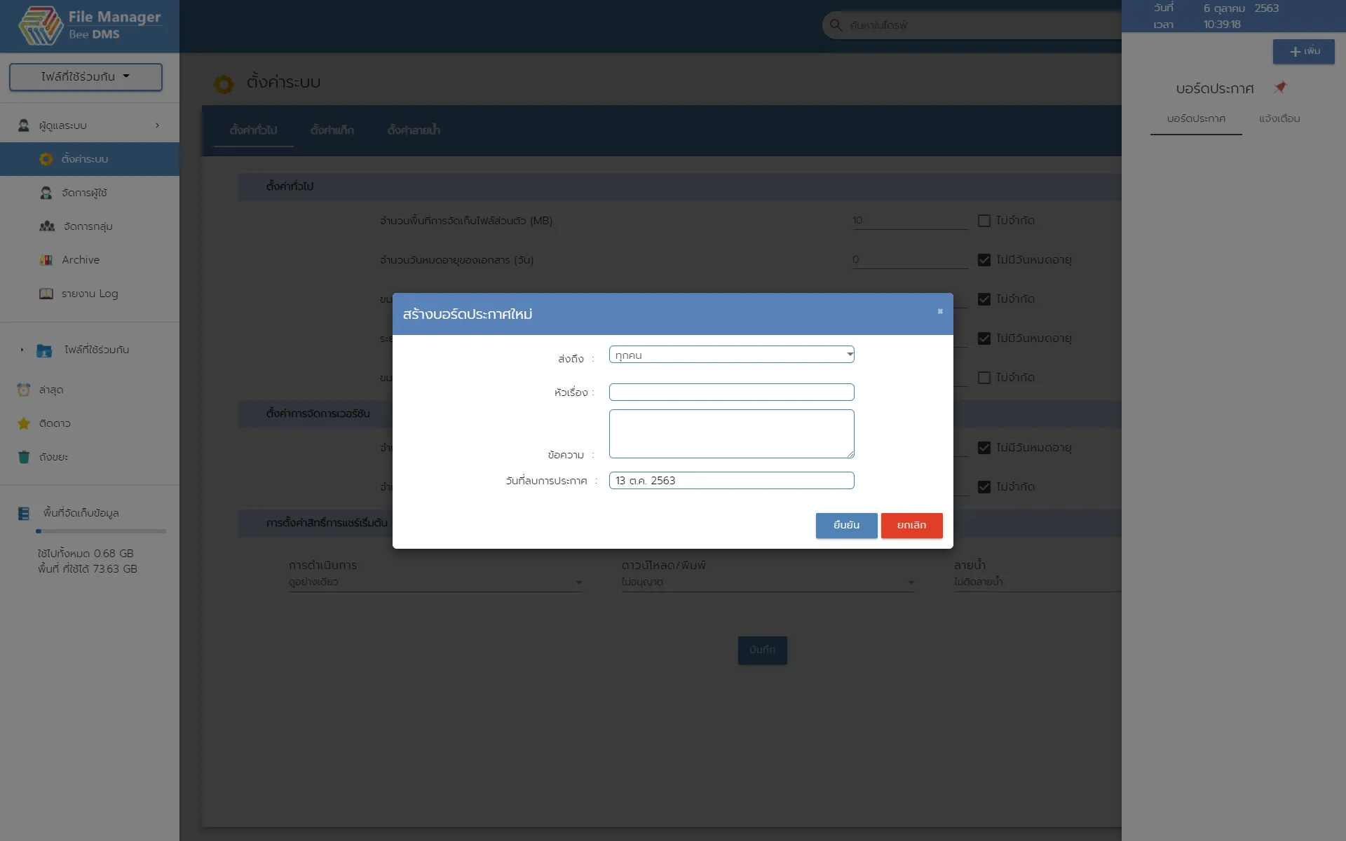 ระบบบอร์ดประกาศช่วยให้ผู้ดูแลระบบ(Admin)ส่งข้อความแจ้งเตือนหรือประกาศไปยังผู้ใช้งานได้อย่างมีประสิทธิภาพโดยรองรับการส่งข้อความทั้งในรูปแบบเฉพาะบุคคลและกลุ่มผู้ใช้งานช่วยให้การสื่อสารภายในระบบเป็นไปอย่างรวดเร็วและตรงเป้าหมาย